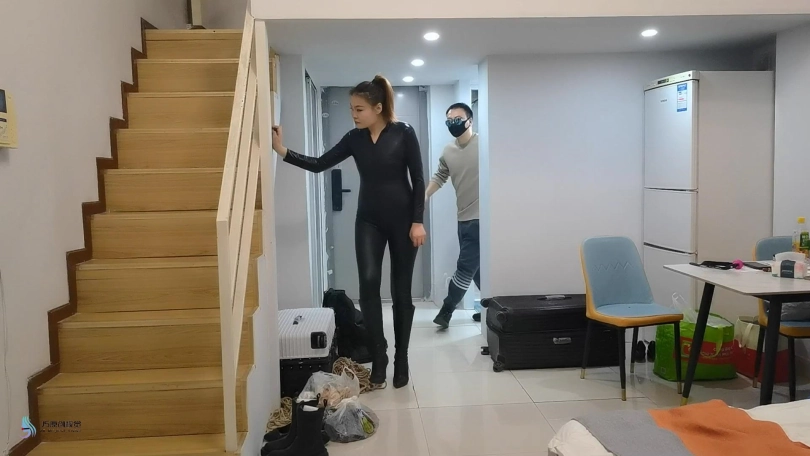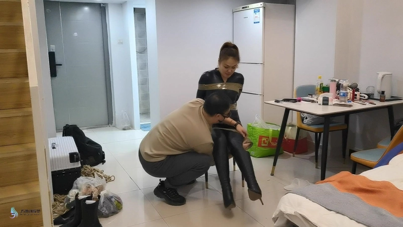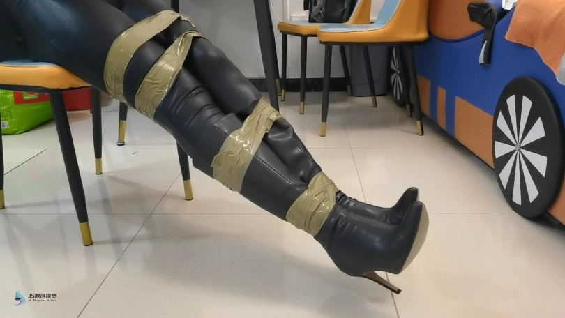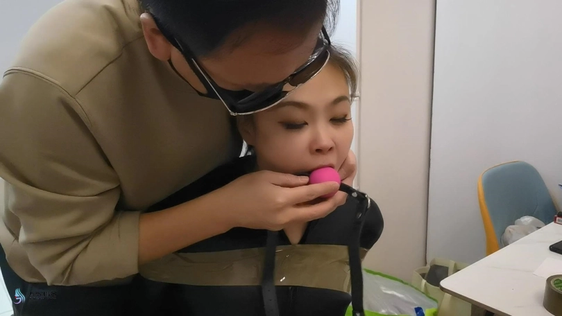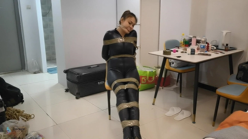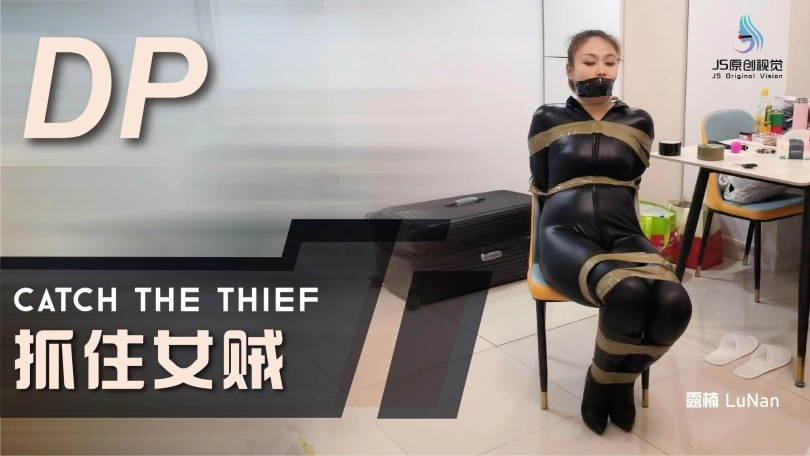 女贼潜入房间偷窃,被房主抓住,用胶带捆绑起来,口球堵嘴。然后换丝袜塞嘴,在用胶带封嘴。