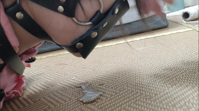 于是小新给她套上皮革束手带 在給她戴上新买的马具面罩口球