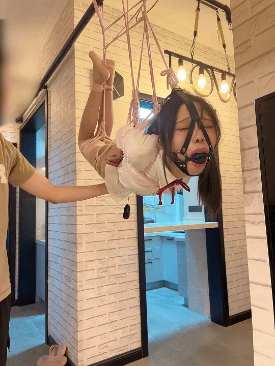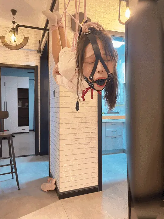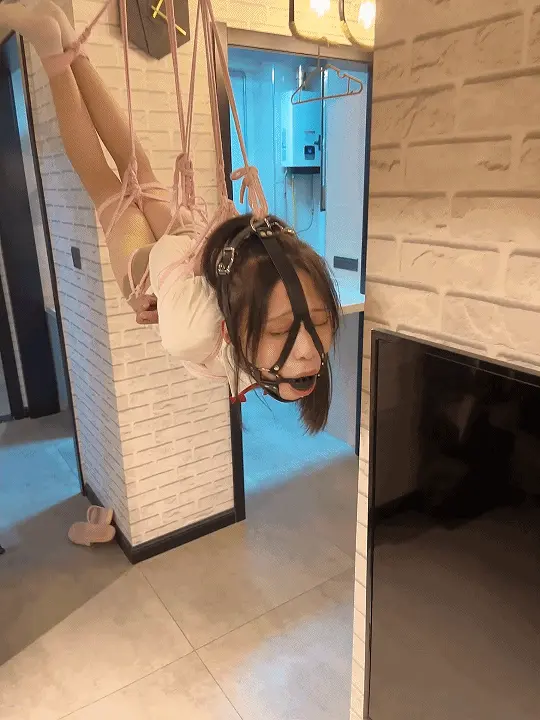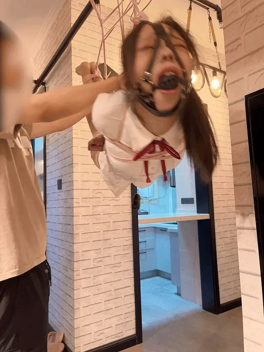 所以刚从椅子挣脱就被驷马吊缚起来,再带上马具口球,打开训练器,一边tk,一边抚摸,还得忍受强制抬头和训练器,非常折磨,但是根本无法逃脱,只能强制[X_X]。