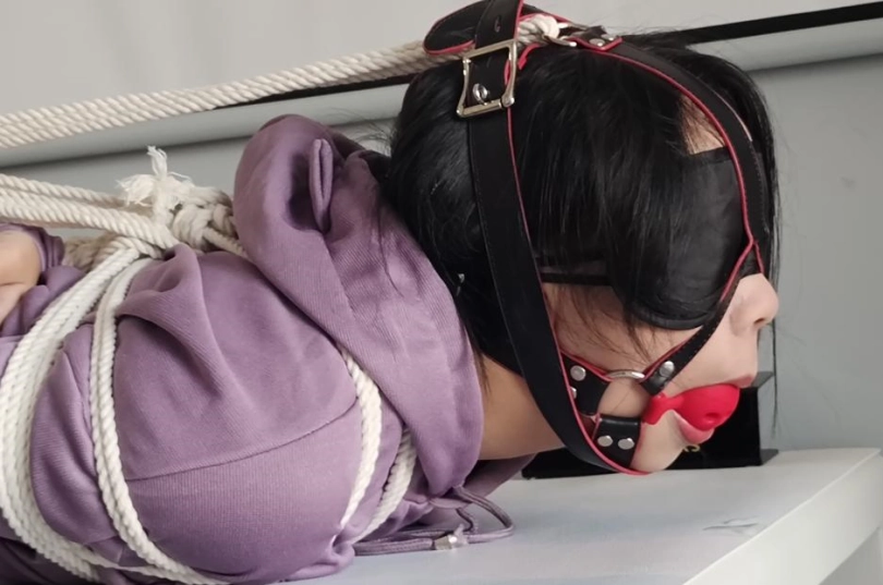 双腿被并缚着 手被捆绑着 嘴上戴着马具口球 想说话说不清 头又被强制牵着 动也不是不动也不是