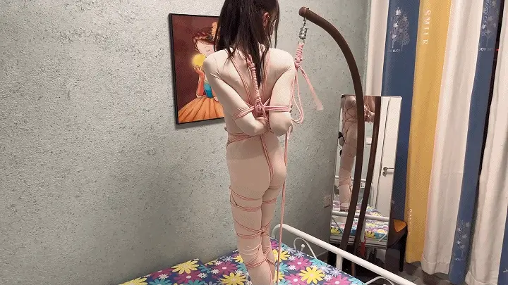 这个系列准备出各种紧缚加道具然后逃脱,往后会越来越难。无法逃脱会有惩罚。这部给晴绑个直臂并腿 脚上还带了镣铐并用绳子和手连接,然后吊在床头吊篮,打开训练器阻碍逃脱,没想到吊起来的那根反而成了助力绳让晴站起来。不然手脚相连是站不起来的。这都能解开,看来下次难度要升级。