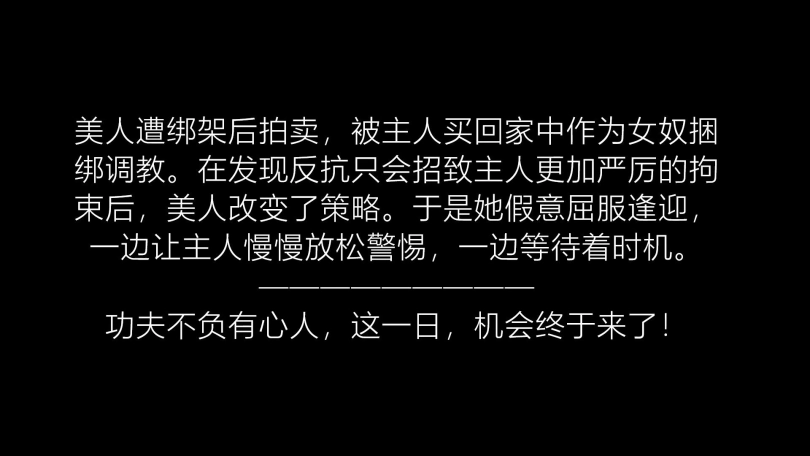 【视频时长】:00:28:12 【文件大小】:990MB 美人(柳洋饰)被人贩组织绑架后拍卖,被新主人买下后带回家中,作为女奴遭到主人的严厉捆绑调教。女奴假意屈服希望使主人松懈,由此寻求机会逃脱。 一日,女奴在房间里扫地,扫到了一把钥匙。女奴趁主人没注意偷偷将钥匙藏起。 恰逢主人有事要出门,走之前需要将女奴拘束,于是主人将女奴带到拘束室。 在拘束室内,女奴环视房间,看到了拘束铁架,想到刚刚捡到的钥匙有些眼熟,隐约记得就是这个拘束架上锁具的钥匙。于是女奴佯装撒娇拉着主人走到拘束架前,请求主人用这个架子拘束她。 女奴乖乖站好,配合主人捆绑,又主动要求戴上眼罩和马具式口球。女奴的顺从让主人非常开心,警惕心完全丧失。捆好后,主人玩弄了一会女奴便放心走了。 主人离开后,女奴开始努力脱缚。女奴使劲挣扎,口中呜呜直叫,尝试了好一会,才终于成功打开手腕的锁扣。随后女奴一一解开身上的绑缚,脱缚成功! 然而当女奴准备离开时,却正好碰到返回的主人。女奴惊骇异常,主人十分气愤。主人将女奴压住,一边厉声训斥,一边扒去女奴的外衣。 主人押解着女奴返回房间,惩戒即将开始! 柳洋小姐姐这次的装扮是女仆装,搭配上白色油亮长筒袜、银色高跟鞋和白色缎面长手套,真的太漂亮了。 这次专门订购了拘束架,小姐姐的表演很棒,表情和仪态都非常到位,紧紧束缚之下更显诱惑。 ![]() ![]() ![]() ![]() ![]() ![]() ![]() ![]() ![]() ![]() ![]() ![]()