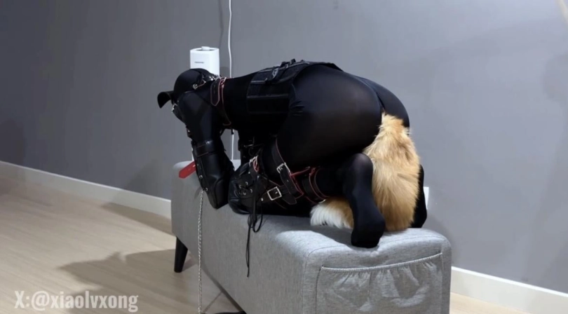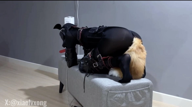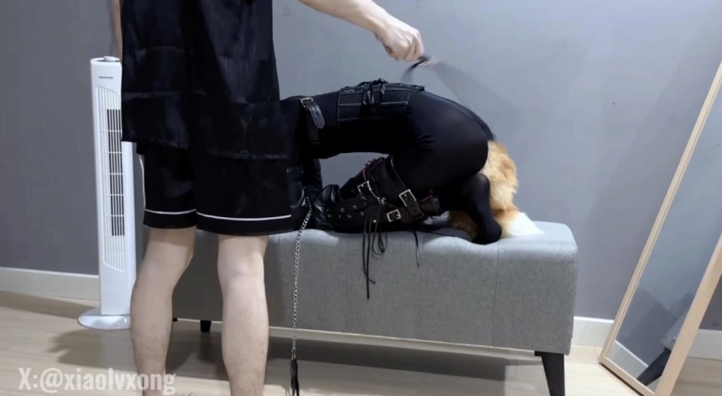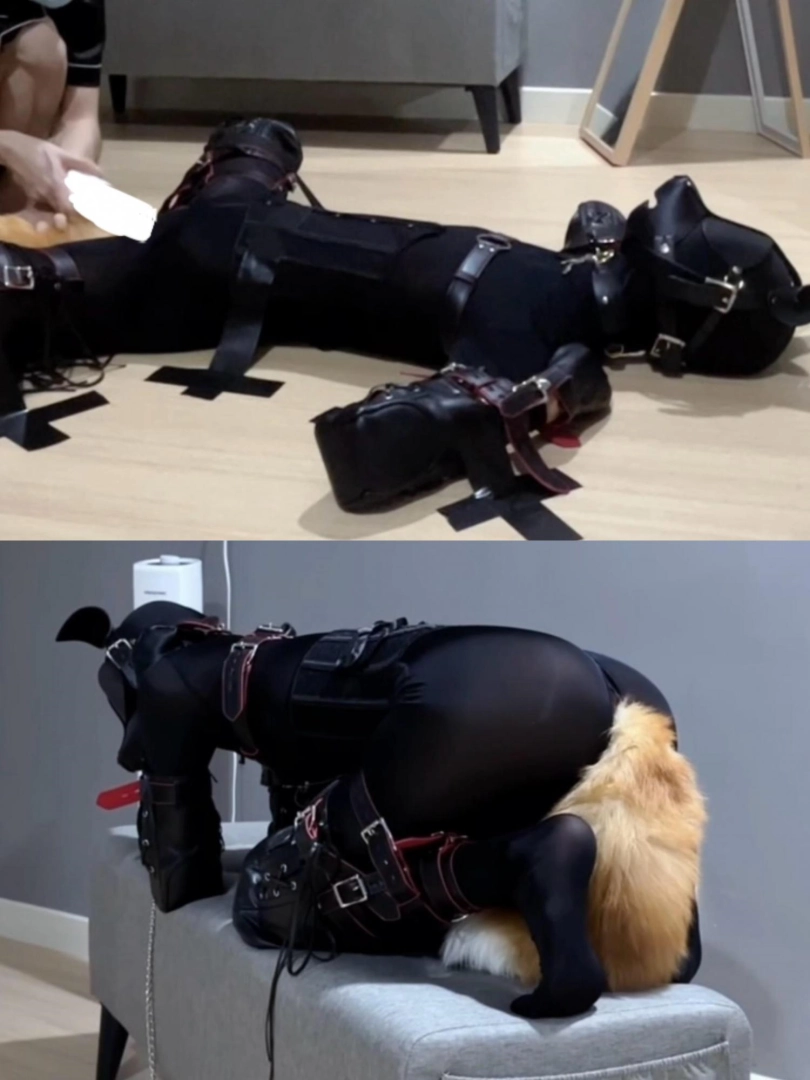接受完爬行和口训练 肯定少不了SP环节了 小狗先是爬在地上被拍子鞭打 为了防止小狗乱动 把它放到椅子上限制活动区域 这样它就逃不掉了