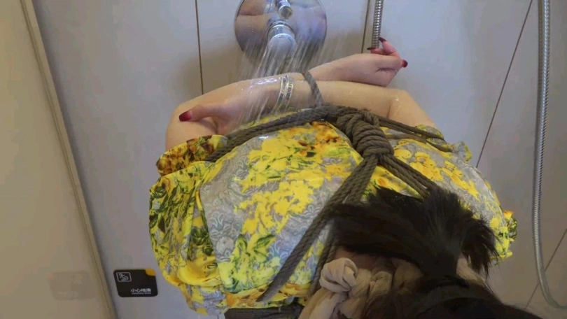 眼镜男觉得只捆绑柳洋还不过瘾,于是将柳洋解开束缚,重新绑好后牵着柳洋来到一家带有浴室的旅馆,一边牵拉着柳洋一边拍着她的屁股向浴室走去。来到浴室后,柳洋已经被加固束缚,并且嘴部的口球换成了丝袜。这可把柳洋难受的不清,被戴上眼罩,外面什么也看不清,只能任眼镜男玩弄。淋浴一番后,眼镜男将柳洋抱进了浴缸,柳洋无处安放的丝袜美腿到处乱蹬,等水没过柳洋后,眼镜男还假惺惺的使劲拉柳洋的股绳,说是把她提起来,避免被水淹过,而这一举动带给柳洋的只有无尽的快-感。