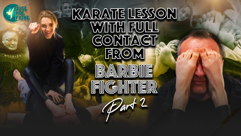 Olga throws a combination of powerful leg kicks this time. Then she rolls the man to the ground and punches him from above. She also uses different ways to strangle the opponent.