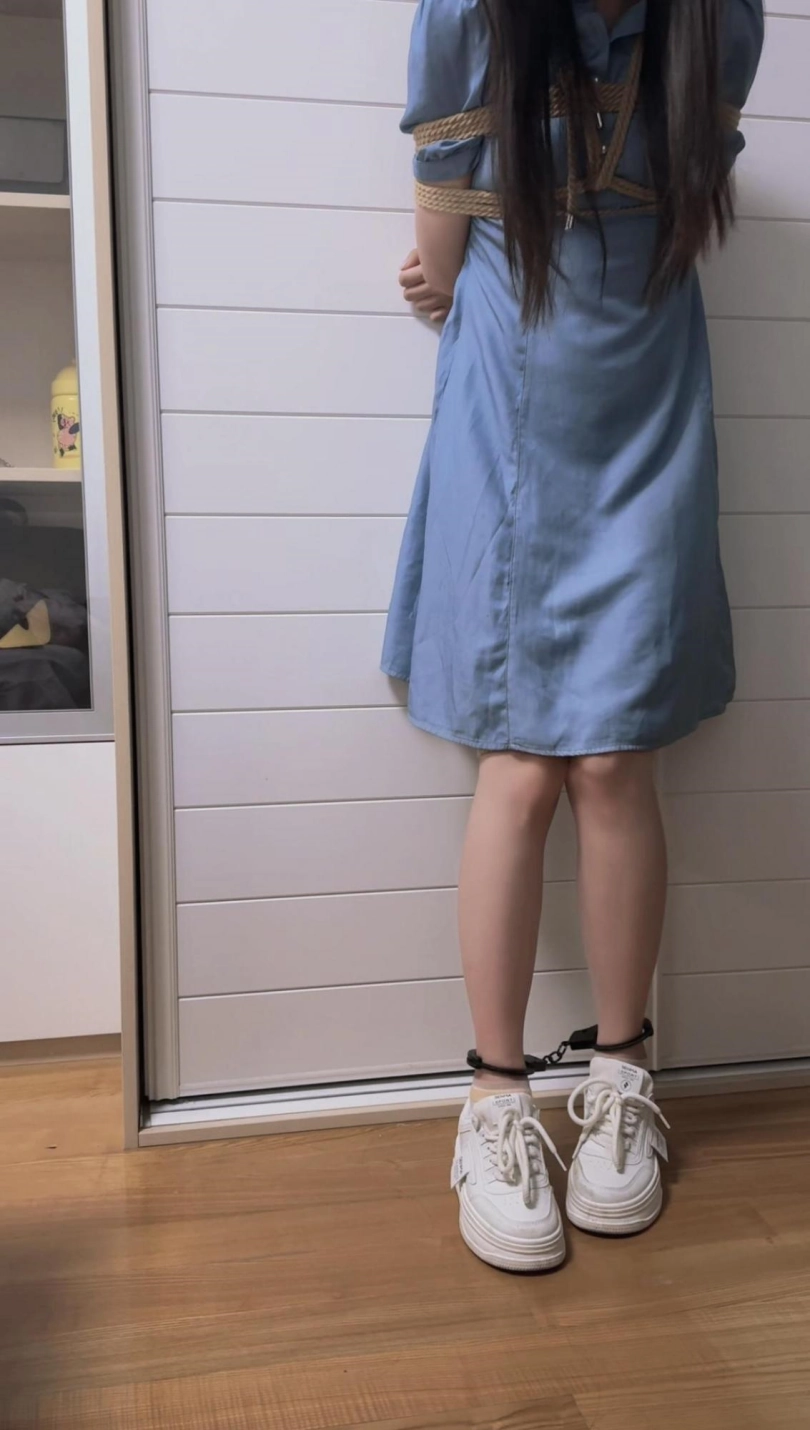 哈喽,今天又是一次日常穿着被绑起来惹。最近几天都超级热,难得和闺蜜出去玩一次,回到家又被绑了(玩完一天后她说要回我家我就知道不对了(-᷅_-᷄)。今天是一条蓝色连衣裙+日式捆绑(可能是? ),绑完后闺蜜说绑得不紧,让我尝试挣开来,然后她就塞了TD在那一直开关,这样能挣脱就有鬼了(`_´)。而且我手在背后摸了半天绳结也没找到qaq。