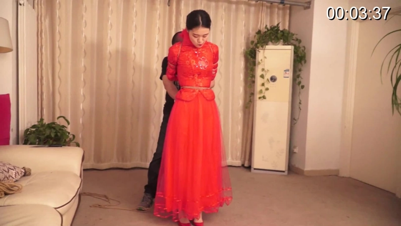 美丽的新娘突然遭到劫匪的入室强制束缚 劫匪KB身穿红色新娘装的美女依然强行KB五花 KB的相当漂亮 挣扎的相当委屈 过了一会 劫匪又让新娘依然换了八色婚纱进行KB 还单腿悬吊 相当不错的紧紧的束缚