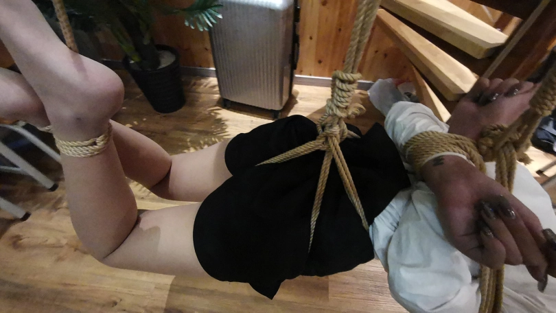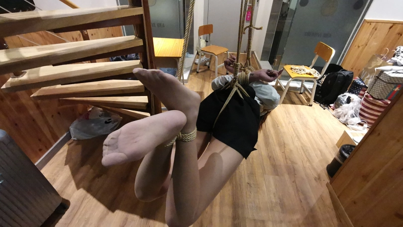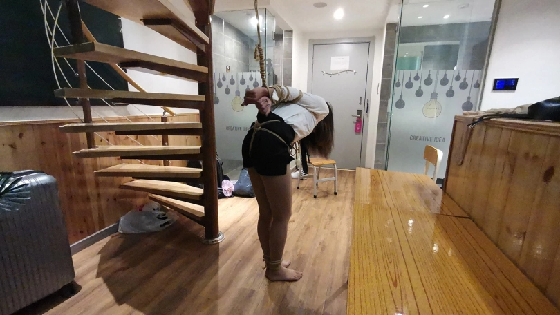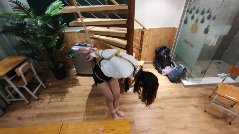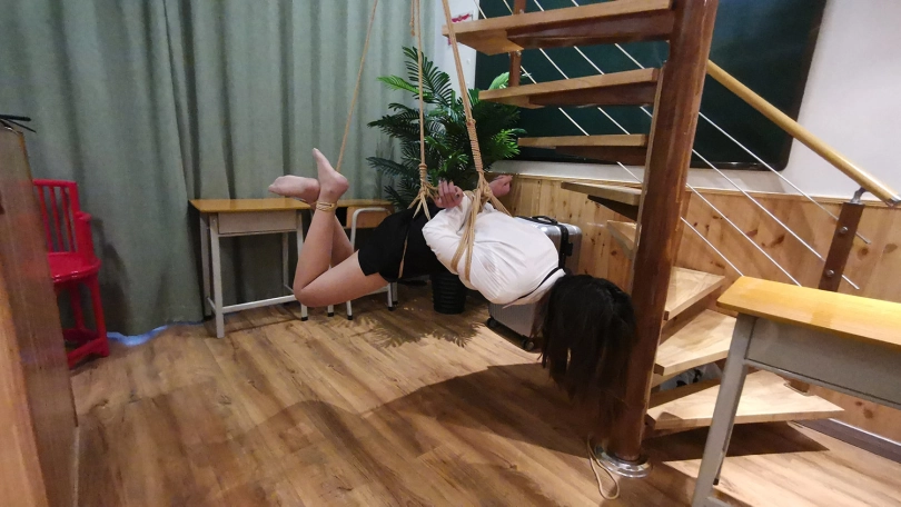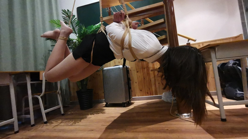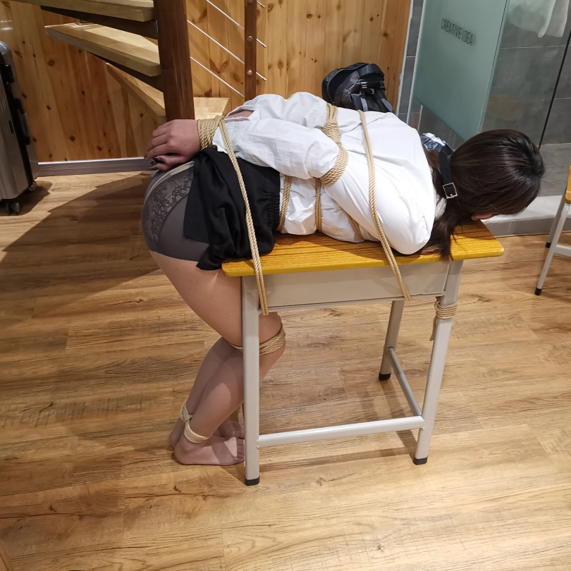 老师半站半趴在桌子上,脖子身体被固定在课桌上,嘴里塞着口球,口水直流;接着又被驷马姿势吊缚;然后后高手束缚,脖子与大腿之间用绳子连接起来,使其抬不起身,弯不下腰。老师绝望的挣扎呻吟。。。(这几个姿势都是比较痛苦难受的,视频里瑾萱的挣扎呻吟喘息也是真实反应)