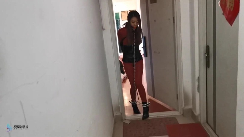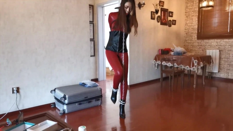 瑾萱穿着红色皮衣,手被单手套束缚,戴上口球,穿着高跟靴的脚也被镣铐铐住。鞋跟比较高,这让她每走一步都很艰难。抽打让她走到楼梯口,可能是她担心有人会过来,找了个借口便回到房间。坐在床上解开她身上的束缚,用[不可描述]棒刺激着她让她体验[不可描述],很快她便呻吟起来。接下来用绳子把她绑成驷马,嘴里塞着丝袜并用胶带封住,防止她吐出丝袜。再用一条丝袜套住她的头,蒙眼。无意中在她的袋子里发现了她穿了一天没洗的丝袜,正好派上用场。把丝袜揉成一团,放在她的面部,让袜尖部位,也是味道比较大的部位放在她的鼻子处。这味道威力还是蛮大的,刚放进去瑾萱就受不了,剧烈的挣扎着,嘴里含糊不清的出说“我不能呼吸了,这袜子太味了。”过了一会感觉她坚持不住了,便解开束缚,瑾萱也瘫在床上。