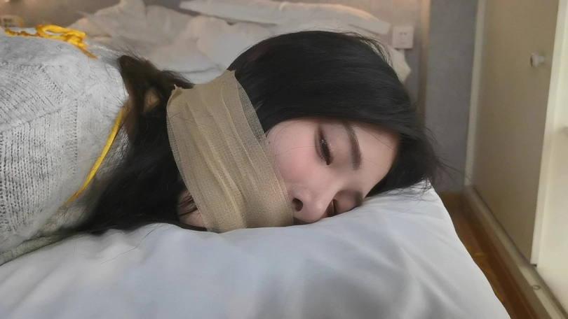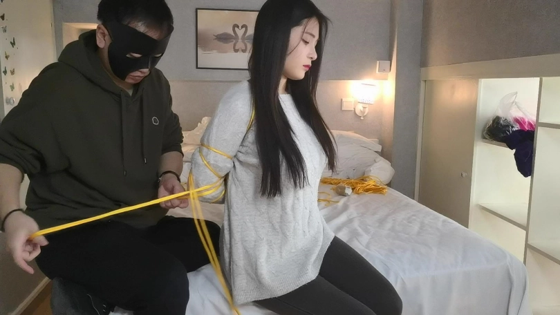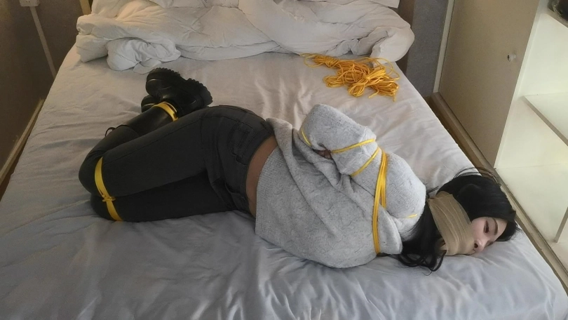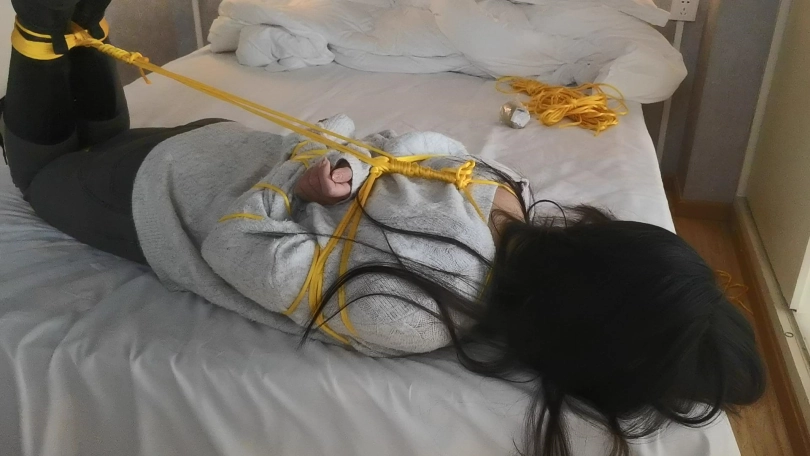 玖念穿着一双黑色长靴,用金黄色的绳子将她驷马捆绑在床上。嘴里用她穿过没洗过的袜子堵嘴,用绷带缠绕。玖念很怕痒,全身几乎每个地方都很敏感,稍微一触碰就会痒的不行,就连朝她肚子吹气她都会用反应。。。
