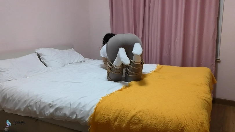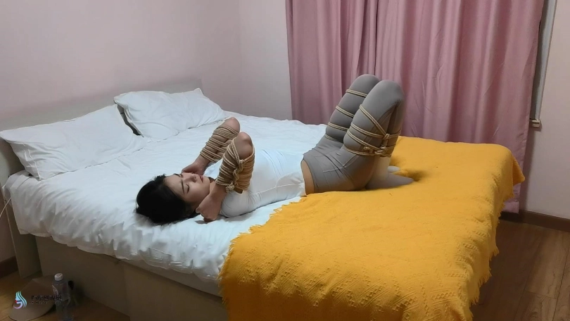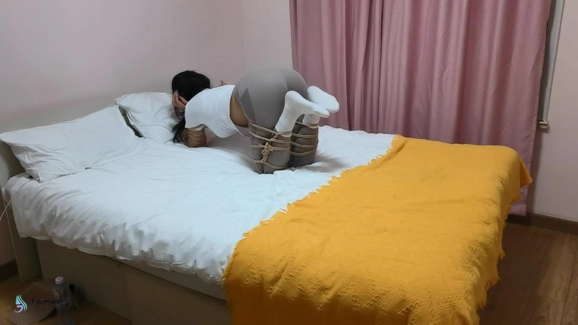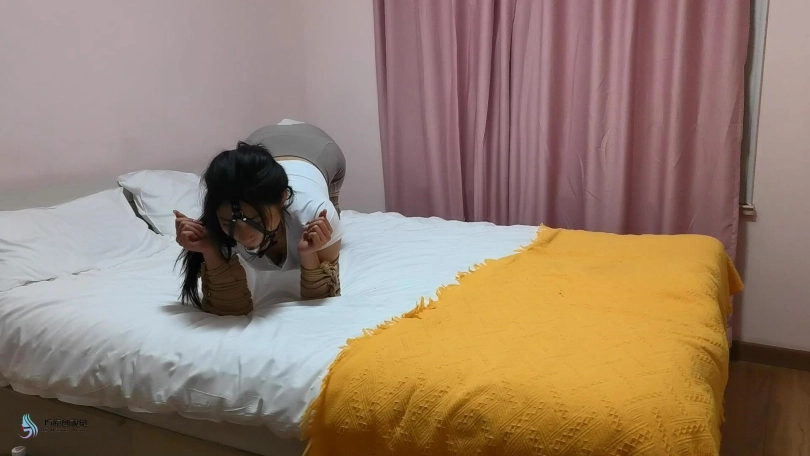 美女挣脱束缚,向门口跑去,但很快被一条绳子缠住脖子,并将她拖回房间力。当画面再次亮起时,玖念的四肢被紧紧的库捆绑起来。她只能用被捆绑的四肢支撑,在床上爬行。这时一个马具型口球出现在她面前。正当她惊慌并好奇这是什么东西时候。口球自己移动并塞进了她的嘴里。可怜的玖念终将被一只囚禁在这个奇怪的房间里。