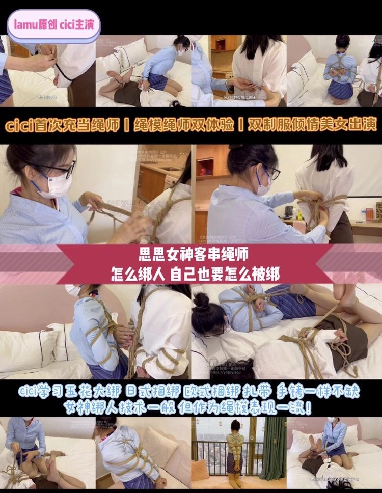 没错,是我们的老熟人,女神Cici,这次,她将摇身一变,做一次绳师,当然,她是有点不懂如何捆的,都是小伙伴现场亲自指导。玩的道具也挺丰富,扎带手铐脚镣肯定必不可少,我们的女神在绳子花式上,也简单学会了五花日式和欧式!当然,做绳师她是不专业的了,还是做绳模专业,所以,所有她学的花式,她都会体验一番!让我们看看她做绳师的精彩表演呗,最后也是会有花絮和总结的,这是我送给大家的小惊喜。