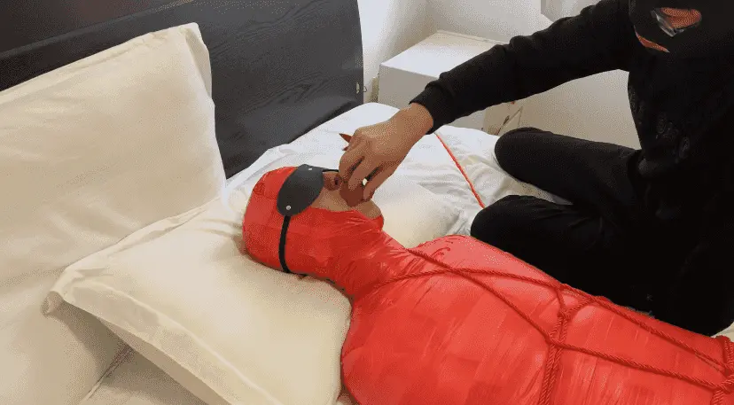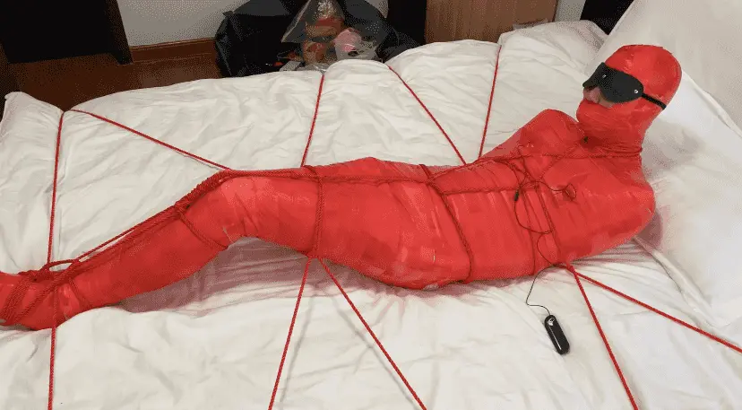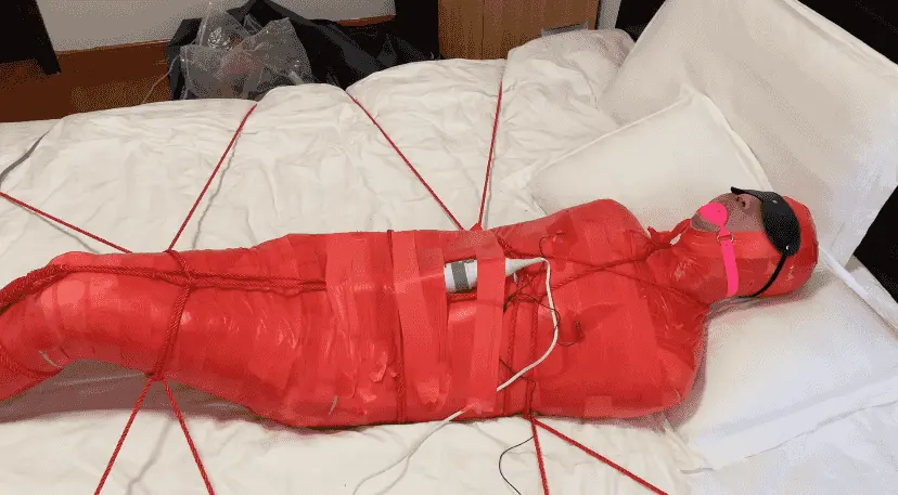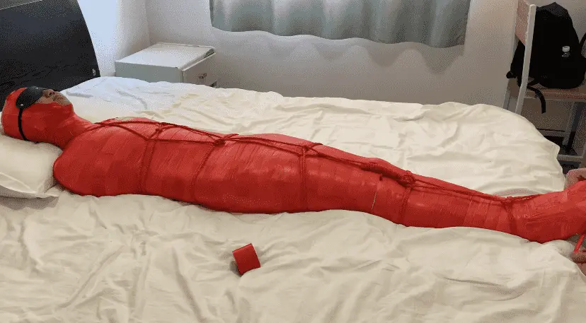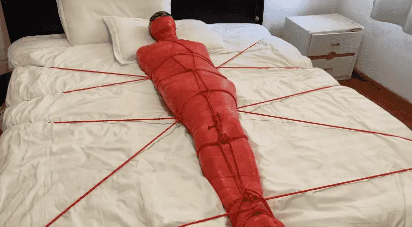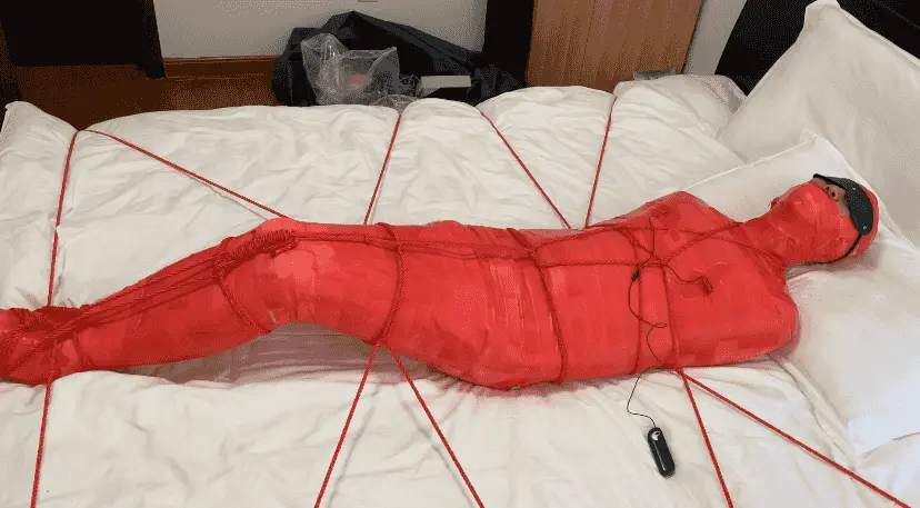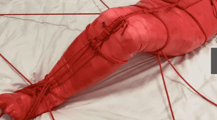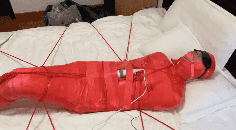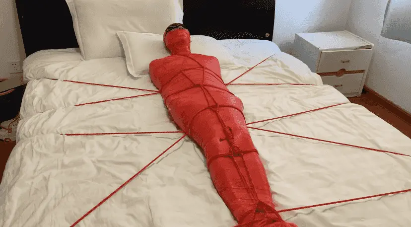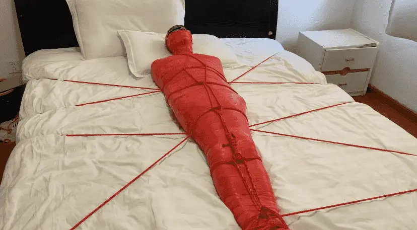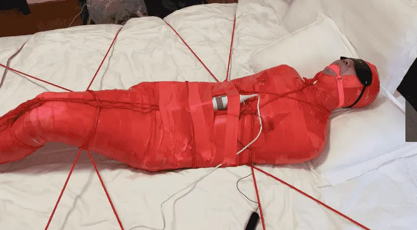 M被保鲜膜和胶带缠绕成一只红色的虫子 被绳子编织成的网固定在床上