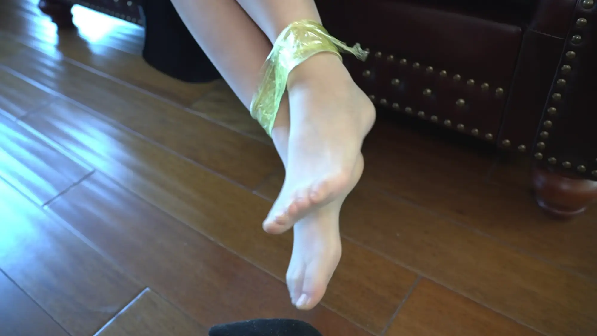 大长腿kk是一名白领,闲来无事居家玩手机,谁料被送快递的歹徒劫持,被歹徒用胶带捆绑并且堵嘴,趁歹徒翻箱倒柜期间,艰难的用丝足一点点的试图解锁手机求救。
