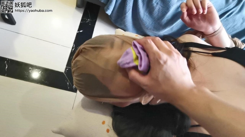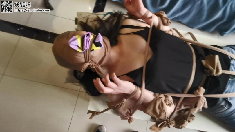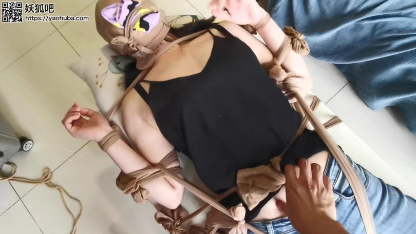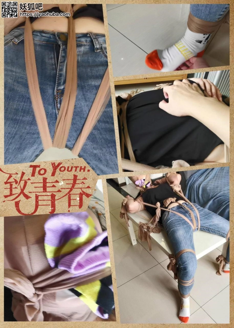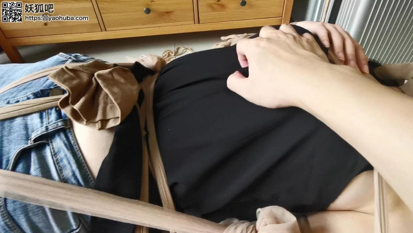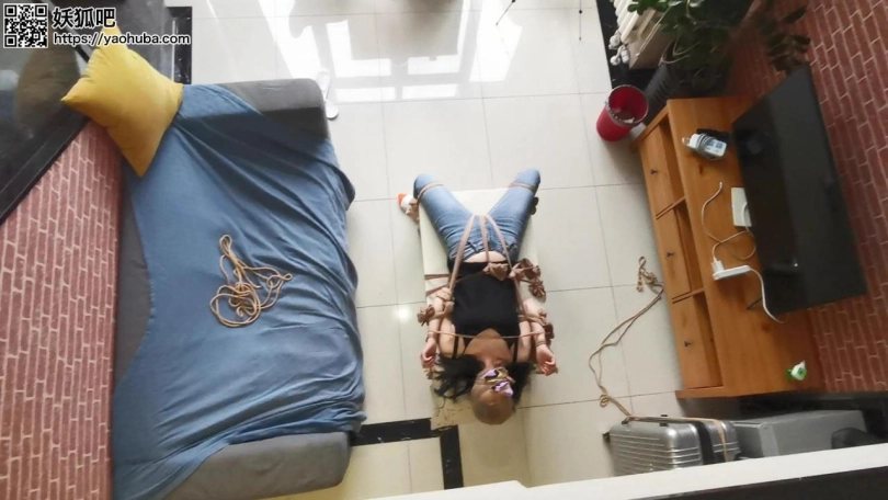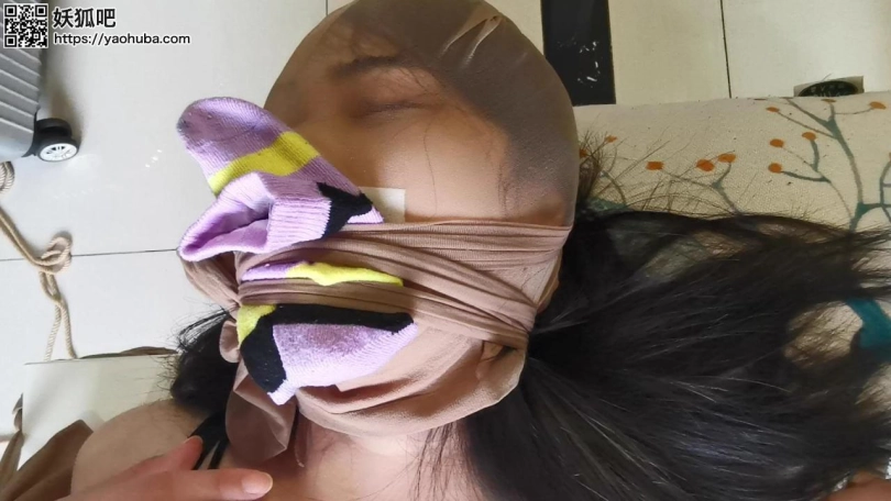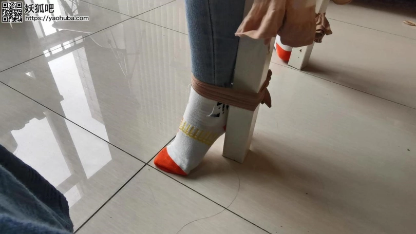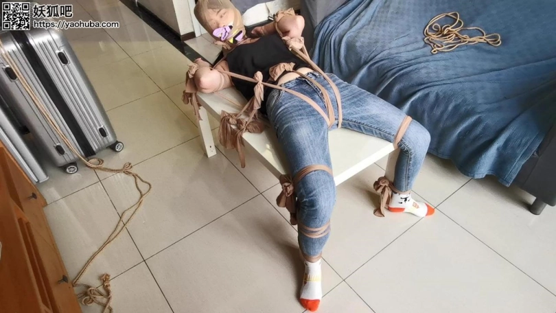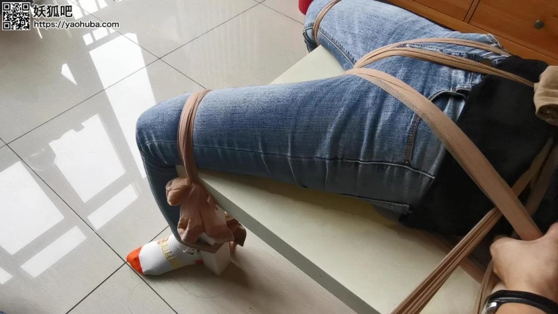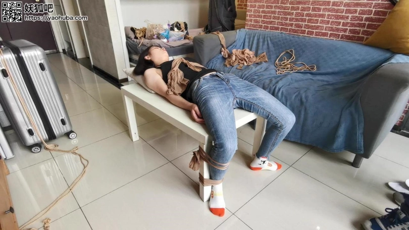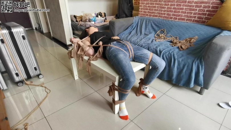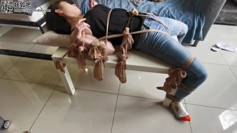 小冷穿着牛仔裤和棉袜,躺在桌子上,全身被丝袜捆绑在桌子上。胶布封住嘴巴,丝袜套头,并用原味棉袜绑在鼻子上,强迫吸入味道。TK挠痒。