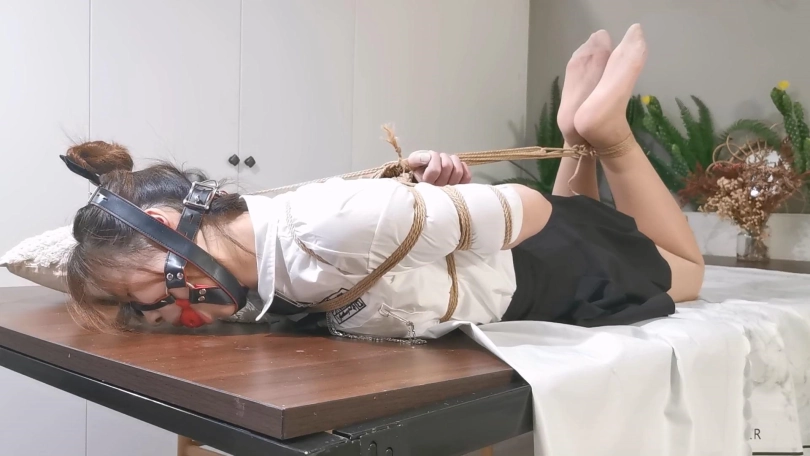 还是JK制服,这次绑的是中式五花,驷马放置在桌子上,并用马具口球堵嘴,还用绳子把口球拉紧,最后玥妍的口水流的桌子上到处都是。