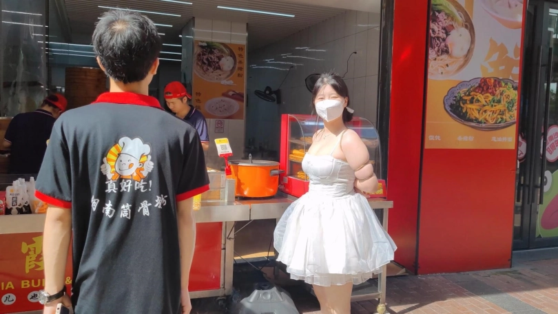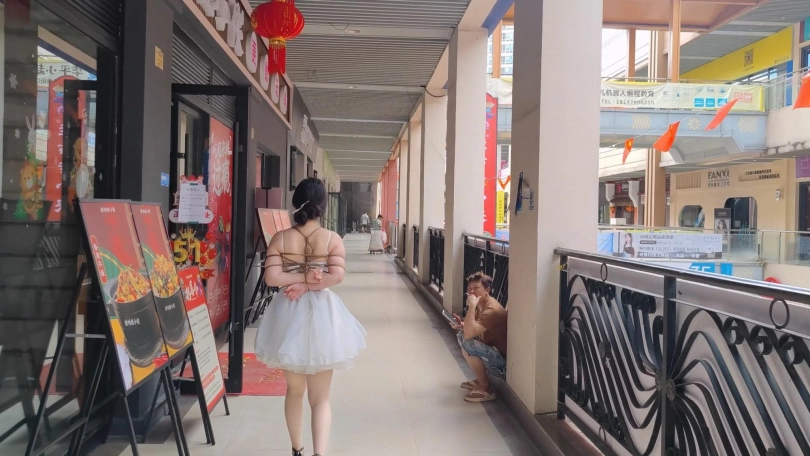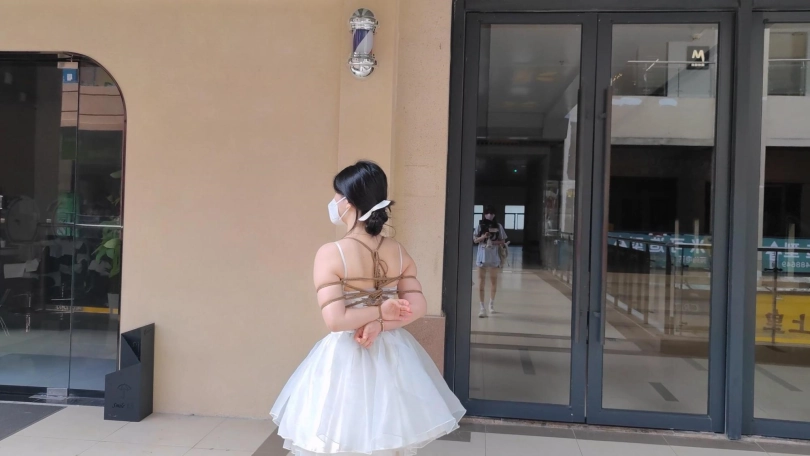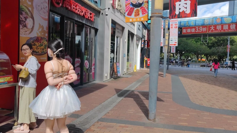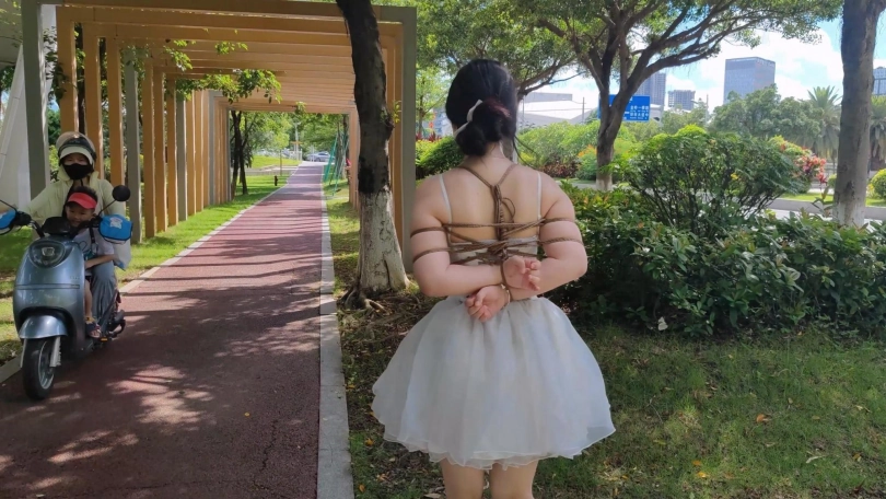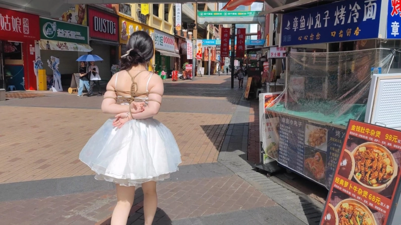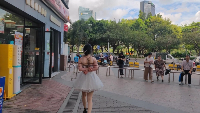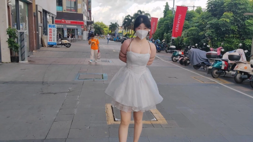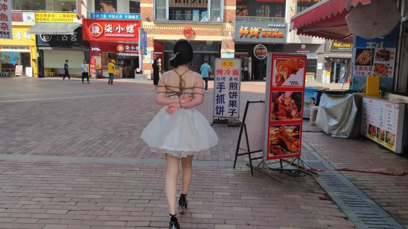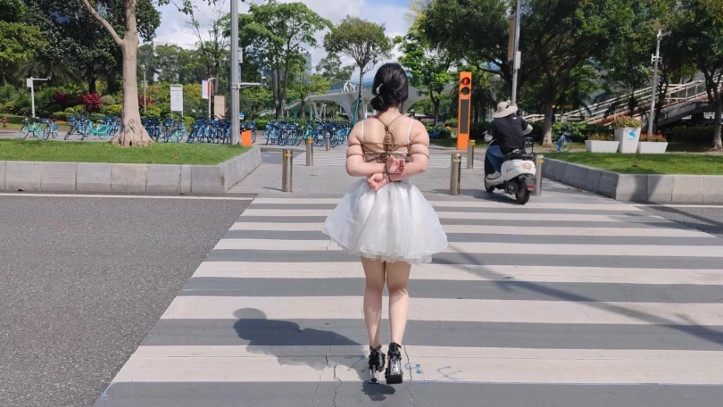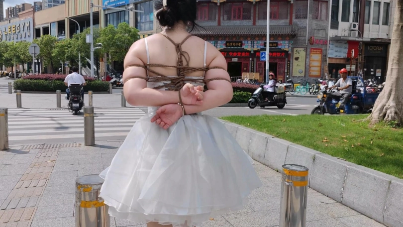 长颜草定拍,模特穿9cm高跟鞋,吊带露背蓬蓬短裙,双手被捆绑,绳子完全外露无遮挡,大白天在商场逛街,挑战被绑着在早餐摊位、便利店购物,路口等候红绿灯,穿越斑马线,路人回头率百分百。