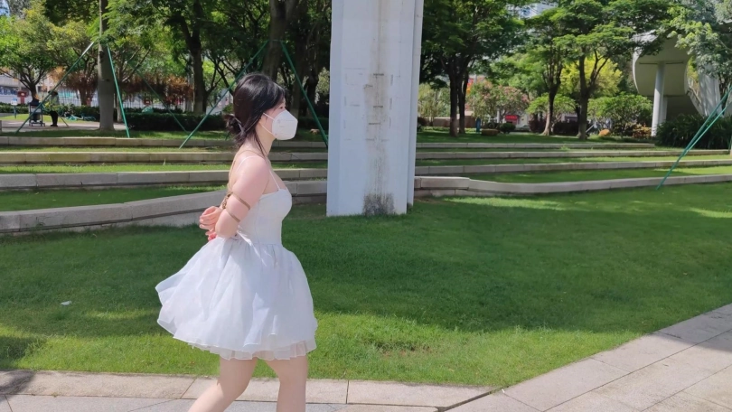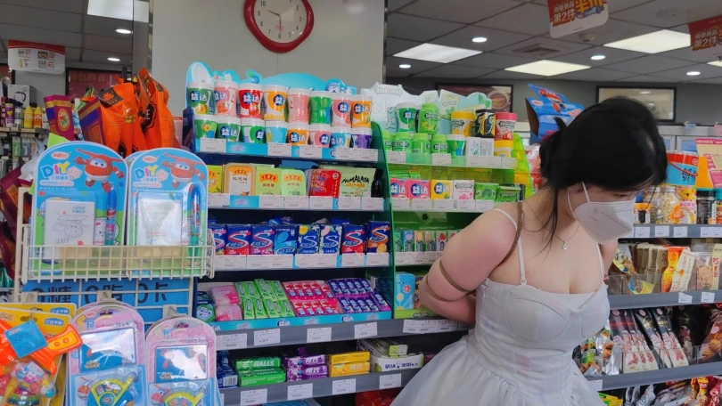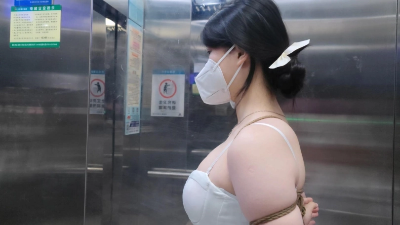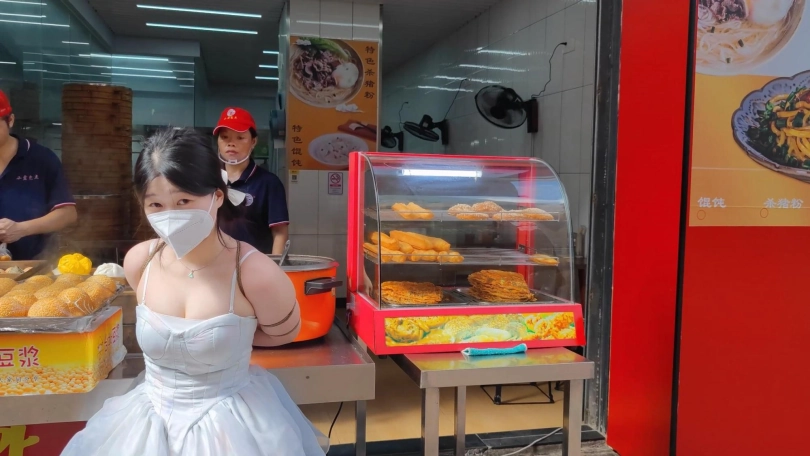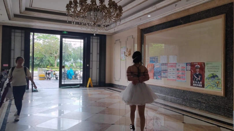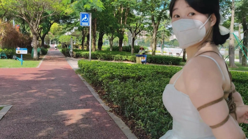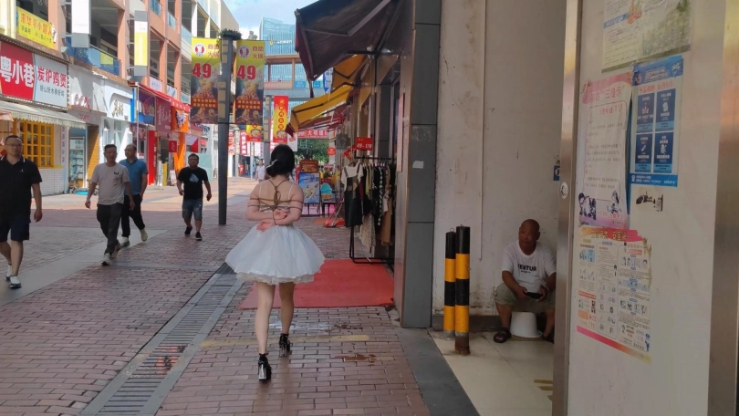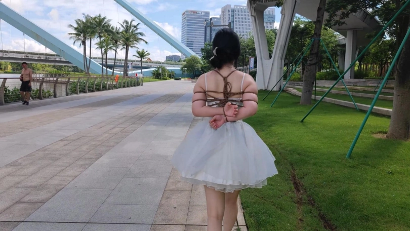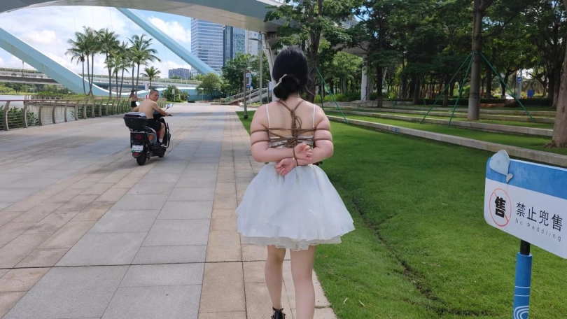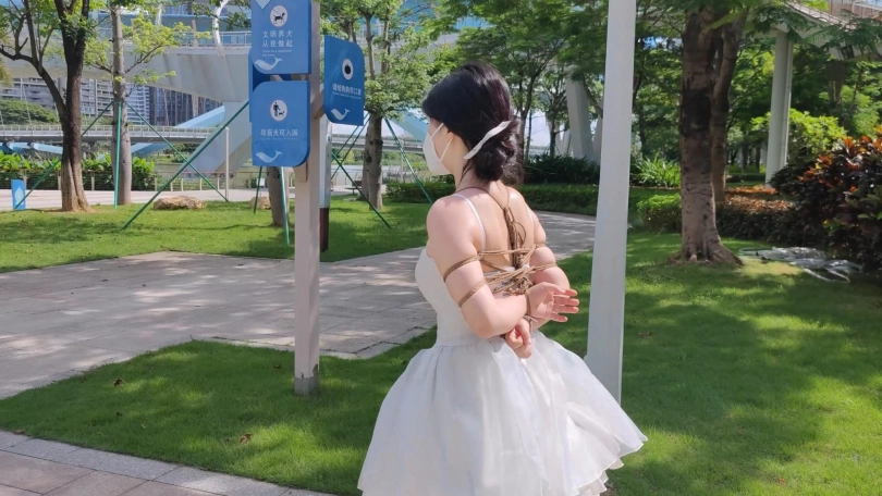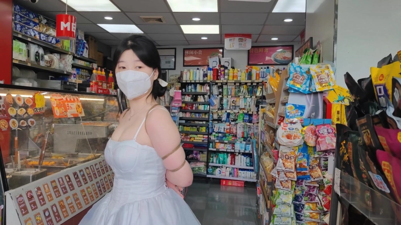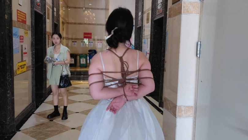 长颜草定拍,模特穿9cm高跟鞋,吊带露背蓬蓬短裙,双手被捆绑,绳子完全外露无遮挡,大白天在商场逛街,挑战被绑着在早餐摊位、便利店购物,路口等候红绿灯,穿越斑马线,路人回头率百分百。