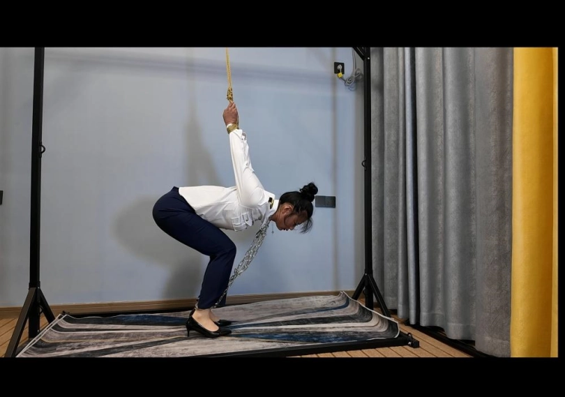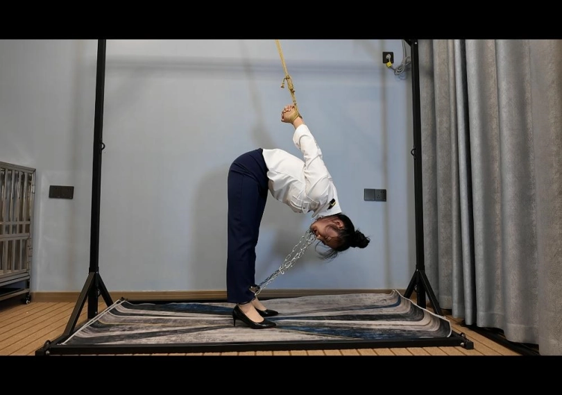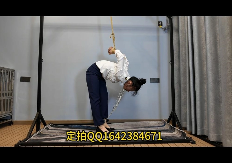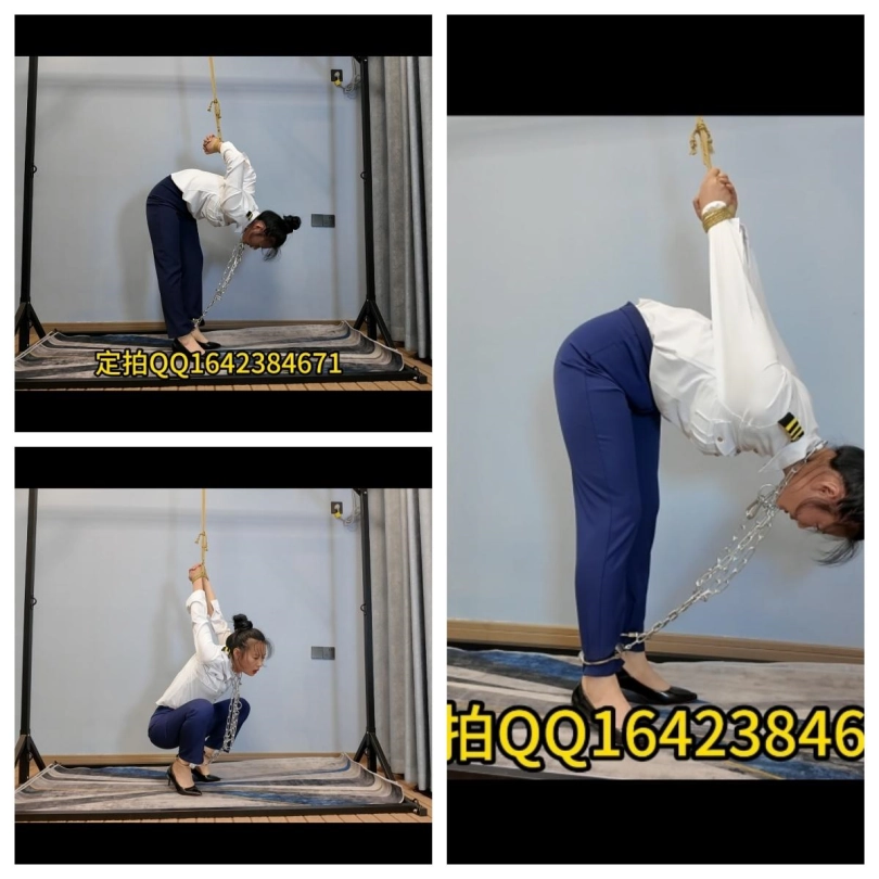 后手高高吊起,脖子用铁链子拴着,连到脚腕,脚腕也要带上手铐,这个姿势特别难受,还要求必须坚持一个小时,这家伙,可是把紫涵吊惨了,放下来说腰都快折了,躺地上休息了半天才起来