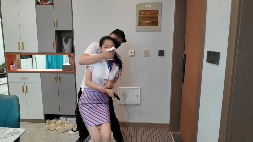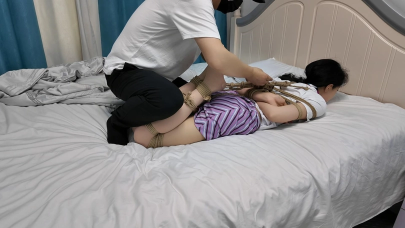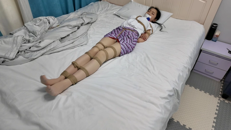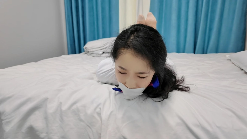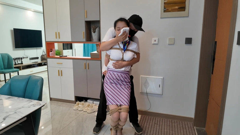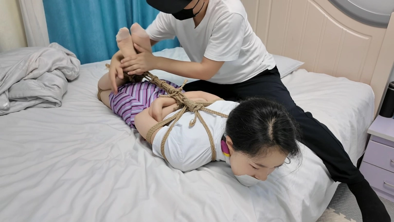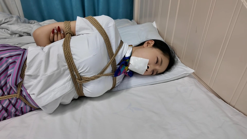 特工雅倩假扮空姐偷偷潜入房间查询资料,不了被早就埋伏的敌手捂晕,绑到椅子上,雅倩拼命挣扎,蹦跳着到了门口,想要逃脱,又被发现,这次被捆绑驷马到床上,胶带堵嘴,里面塞上丝袜,又挠脚心折磨