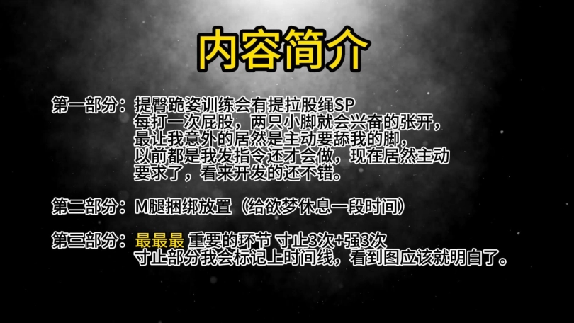 第二部分:M腿捆绑放置(给欲梦休息一段时间)第三部分:最最最 重要的环节 寸止3次+强3次寸止部分我会标记上时间线,看到图应该就明白了。