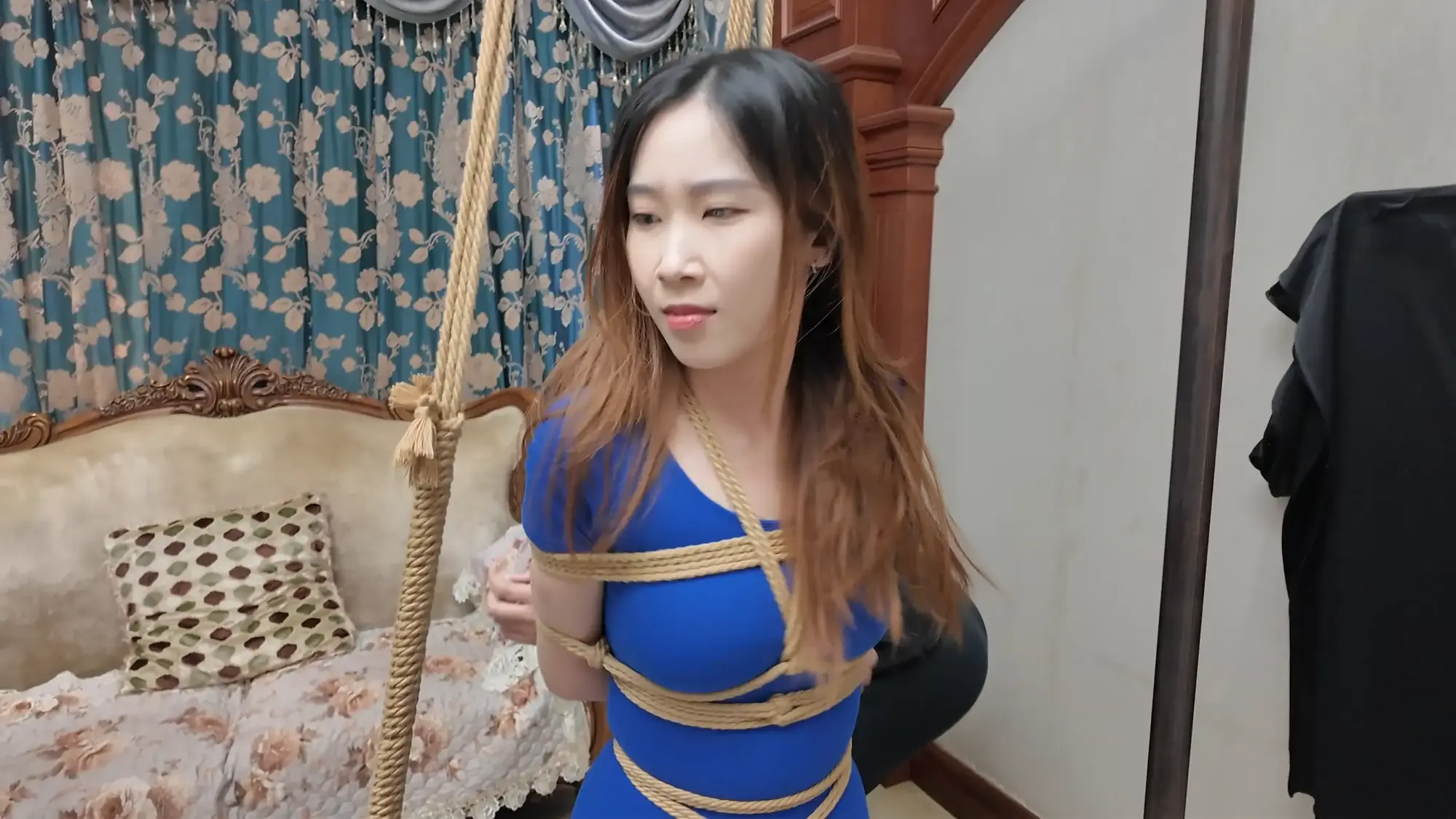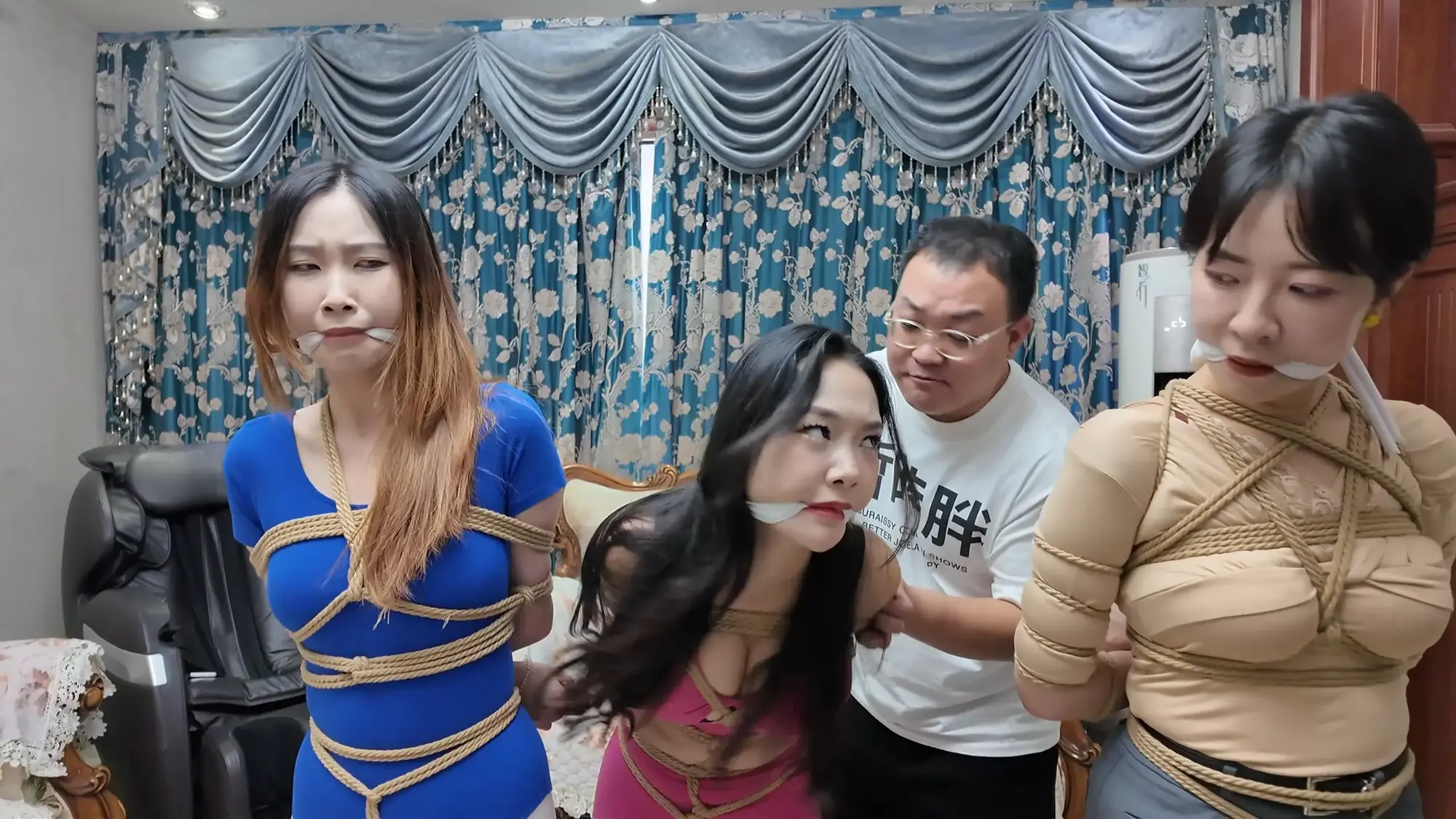 【视频时长】:00:39:08 【文件大小】:2404MB 米粒和佳雯对剧本的理解都很精准,完全代入了角色,尤其是米粒扮演的e小姐,笑面虎和媚女的形象切换演绎的淋漓尽致,佳雯则是稳定发挥,把本系列中雷姐角色泼妇毒蛇的形象塑造的极为形象,南清虽然演技上不如前两位,但进步也是肉眼可见的,尤其是说台词和敢直视镜头这两个方面,希望再接再厉。 前情提要,南清探员逃跑失败,再次被雷姐的手下抓住,雷姐也被自己的手下背叛。此后,南清与雷姐被囚禁起来,两人分别被换上体操服与瑜伽服遭受折磨。某一日,南清被单腿吊缚,雷姐则是头戴马具,嘴塞口球,m字开腿坐在椅子上,两人照常被两个男人玩弄,小弟表示马上就要把她们卖掉有些舍不得,大哥告诉他自己准备黑吃黑,钱和人自己都要,并说利益最大化是雷姐教给自己的,看到雷姐依旧瞪着自己不肯屈服,大哥开始用力锤击雷姐的腹部,并拉扯雷姐的股绳教训她,一旁的南清也一样不服气,被拿掉口球后依旧放狠话要杀了他们,两个男人大笑嘲讽,小弟拿起鞭子开始教训南清。过了一会儿,大哥的手机发来买家的短信,他命令小弟把南清和雷姐捂晕关到卧室里,一切准备妥当后,大哥让小弟下去接人,自己做好偷袭的准备。 画面一转,e小姐出场(米粒扮演),她提着箱子边走边接起电话,电话另一边的老大命令e小姐拿到获取后就把卖家干掉,e小姐轻蔑一下说一定完成任务。e小姐与小弟会面,被小弟带上了楼。刚刚走进屋子,e小姐就察觉到了不对劲,并让躲在角落里的人出来。随后大哥拿着枪走了出来,夸奖e小姐是个狠角色并且还是个大美人,e小姐表示他们胆子不小敢黑吃黑,并告诉他们如果让自己的老大知道他们怎么死的都不知道。小弟不耐烦的让e小姐放下箱子,双手背后站在一边。e小姐淡定自若的照做,并用充满挑逗的口气说不开枪杀了自己,摆这个姿势是不是要绑。小弟验完钱后大哥回应e小姐本来是准备一枪干掉她的,但实在舍不得杀掉眼前的大美人,于是大哥命令小弟拿绳子去,将e小姐紧密捆绑了起来(捆绑过程全记录),捆绑的过程中e小姐不停挑逗眼前的两个男人,把两个人迷惑的神魂颠倒,但为了保险起见,大哥先让小弟把米粒关起来,慢慢料理她。 e小姐被带到了关押南清雷姐的房间,小弟拿掉南清雷姐的口球让她们聊聊天,雷姐刚被摘掉口球就开始痛骂,被小弟教训了之后暂时老实了下来,坐在一旁的e小姐嘲讽雷姐被自己的手下背叛滋味不好受吧,雷姐惊讶的问她怎么知道这些的,而思维敏捷的南清直接猜出了e小姐的身份,并问她是不是被黑吃黑了,e小姐起身夸奖南清,并疑问南探员这么厉害的角色是怎么被抓到的,而南清则是反嘲她又是怎么被抓到的,e小姐一脸妩媚的弯腰凑近南清说都是为了得到南清才亲自出马的,结果被南清呵斥骂开,一旁的雷姐嘲笑e小姐只会嘴硬,还夸南清骂的好。e小姐突然变脸一脚踩在了雷姐的腹部上,辱骂她丢了同僚的脸,雷姐也不甘示弱骂了回去,南清则是在一旁劝架。听到吵闹声的两个男人跑了进来,拉开了e小姐。e小姐又突然变脸,一脸娇羞对着两个男人撒娇,并请求能不能把绳子松一松,看到这个情景的雷姐和南清都露出了不可思议的表情,辱骂e小姐不要脸。大哥表示既然她们三个都火气这么大,就帮他们泄泄火,南清雷姐e小姐被布条勒嘴带出了房间,站在一起的雷姐与e小姐依旧互不相让,用身体撞对方,被大哥拉开。三人被强制按倒在地用皮鞭抽打... 结尾下集预告,雷姐被脱掉外衣,内衣捆绑;e小姐挣脱束缚对峙面具男被石头击落手中的手枪;e小姐南清雷姐再次被捆绑起来,被神秘人拉着绳子带走。 ![]() ![]() ![]() ![]() ![]() ![]() ![]() ![]() ![]() ![]() ![]() ![]() ![]() ![]() ![]() ![]() ![]() ![]() ![]() ![]() ![]() ![]() ![]() ![]() ![]() ![]() ![]() ![]() ![]() ![]() ![]() ![]() ![]() ![]() ![]() ![]() ![]() ![]() ![]() ![]() ![]() ![]() ![]() ![]() ![]()