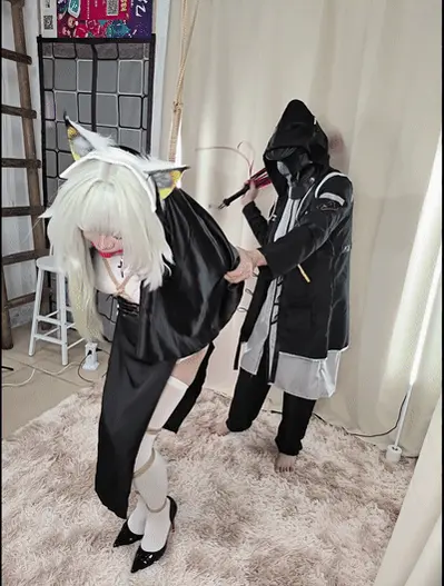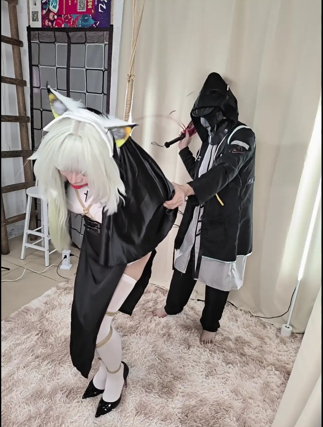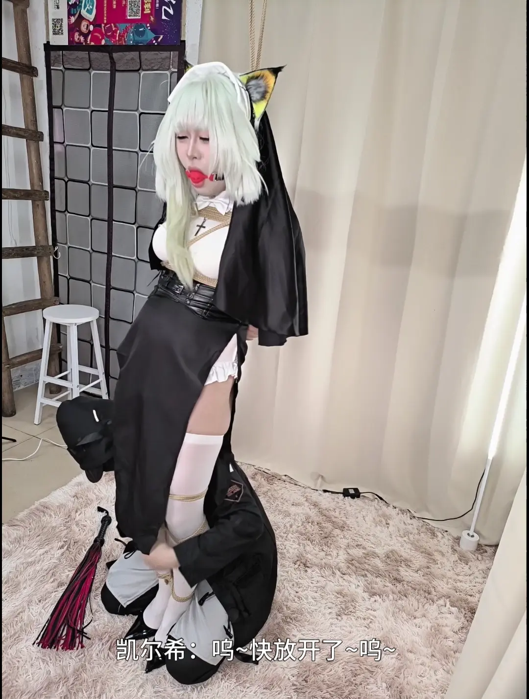 凯尔希身穿修女服,全身被紧紧绑着吊起,犹如被审判的巫女。无助的挣扎只会让绳子更紧。博士拿着鞭子,打量这凯尔希。说道:“牢猫作为主人的宠物,居然敢反抗你的主人看来不好好惩罚一下你,是不会乖乖听话了。相信这条鞭子会让你变得听话的。只要你好好听话,主人会给你奖励的,你看这逗猫棒(振动棒)你是不是很喜欢。哦齁~那是你能发出唯一的声音”