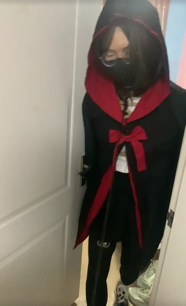 学生制服,短裙,黑丝过膝袜,透明短靴。前面穿戴好贞操锁,后面塞上尾巴,贴好郊狼,身体再被紧紧绑缚起来,披上斗篷就出门吧