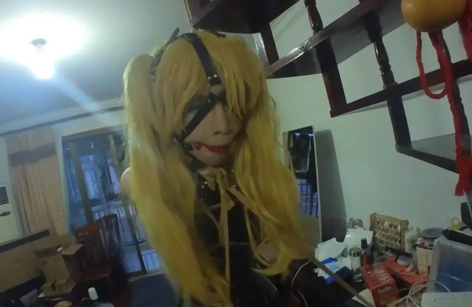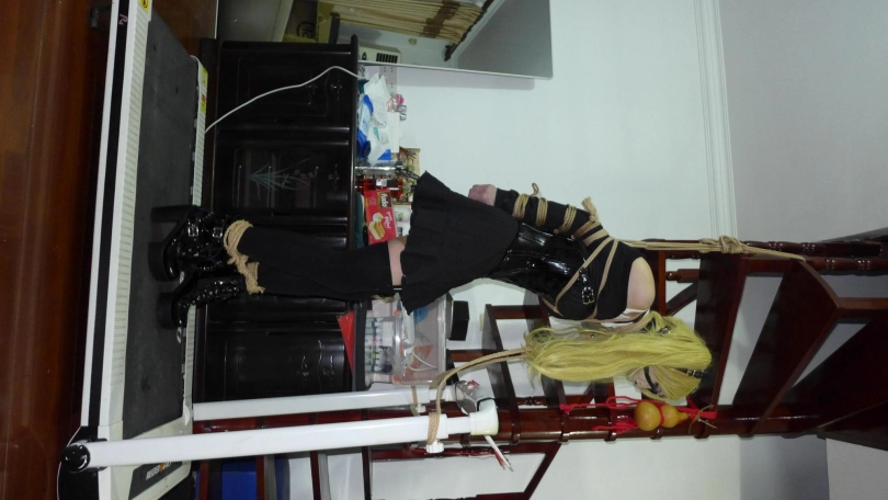 被紧紧的直臂捆绑住,吊在楼梯上,脚上也被拴上了绳子,下面塞满了玩具