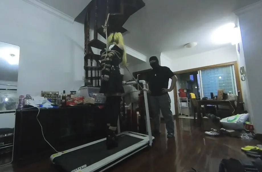 跑步机打开之后就必须一刻不停地走起来,只要停下就会被拖着走,但是身体全身都被绑紧,也只有脚能够进行有限的活动