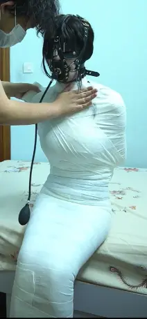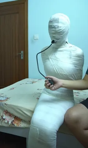 用白色绷带把可爱的jk少女一圈一圈的包紧,还狠心的塞上了巨大的充气口塞,再用绷带把口塞紧紧包裹在里面,打包好后,打开早就准备好的郊狼,看着小可爱在床上无助的扭动挣扎,像一条白色肉虫