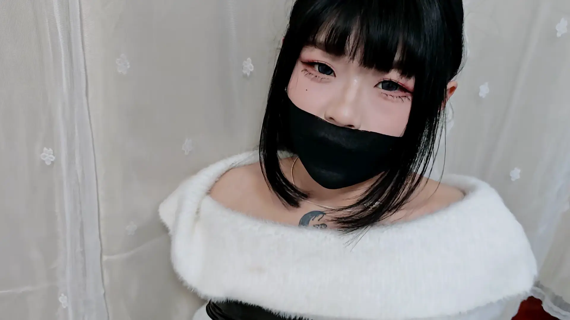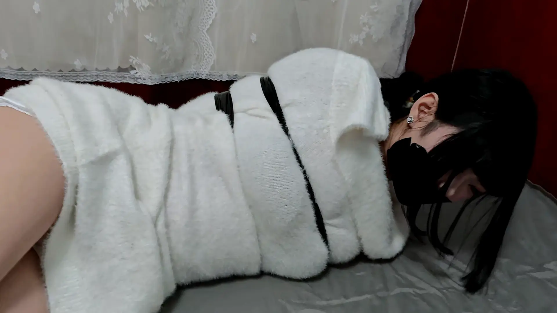 一件毛绒绒的居家连衣裙,其实本来是一件外穿的裙子来着,因为穿着太舒服就当成居家服了hhh。捆绑用的是静电胶带,第一次被这种胶带绑,刚开始还感觉蛮舒服,因为很有弹性觉得可以很轻易的挣脱的样子,但是可能绕的圈数有些多所以依旧没有成功,反而挣扎的时候被勒的很疼