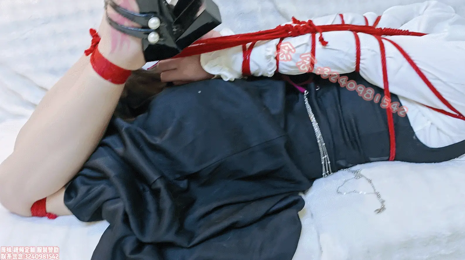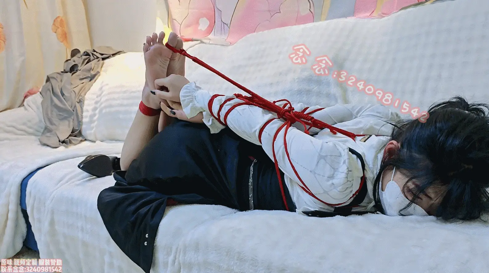 直臂是驷马捆绑,放置在沙发上,先穿着鞋子,过了一会后脱掉鞋子把脚趾也连在驷马上。//脚趾连驷马紧缚感好强,整个脚都要强行绷直,但是也真的很疼