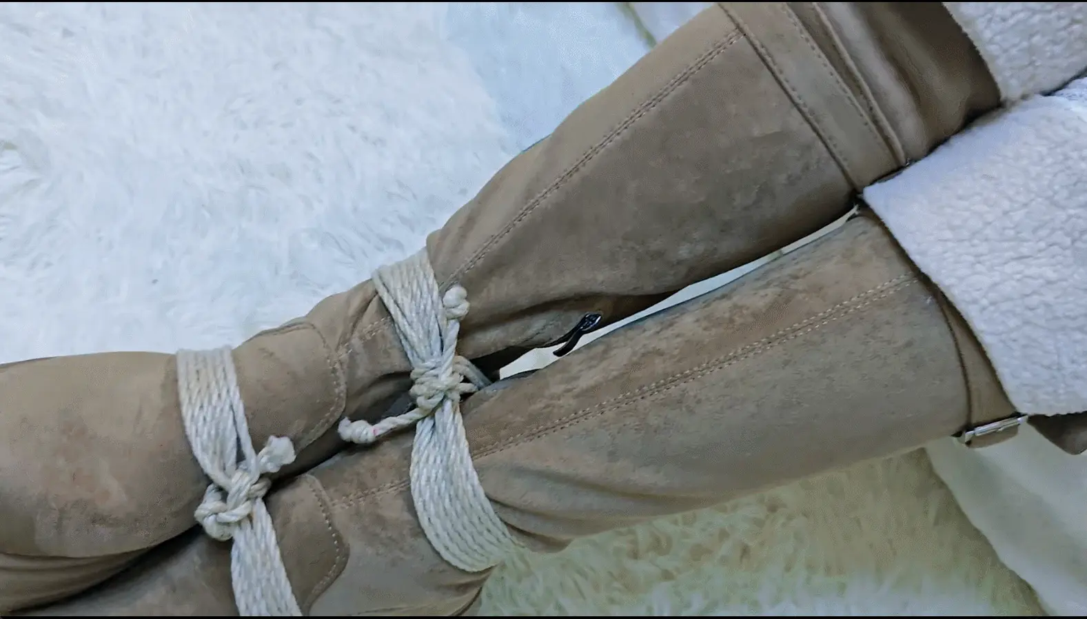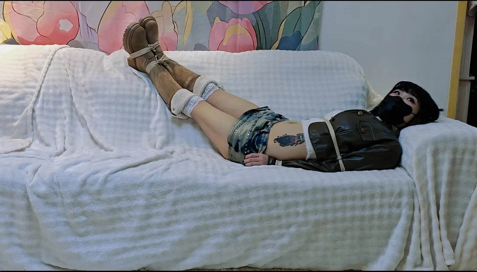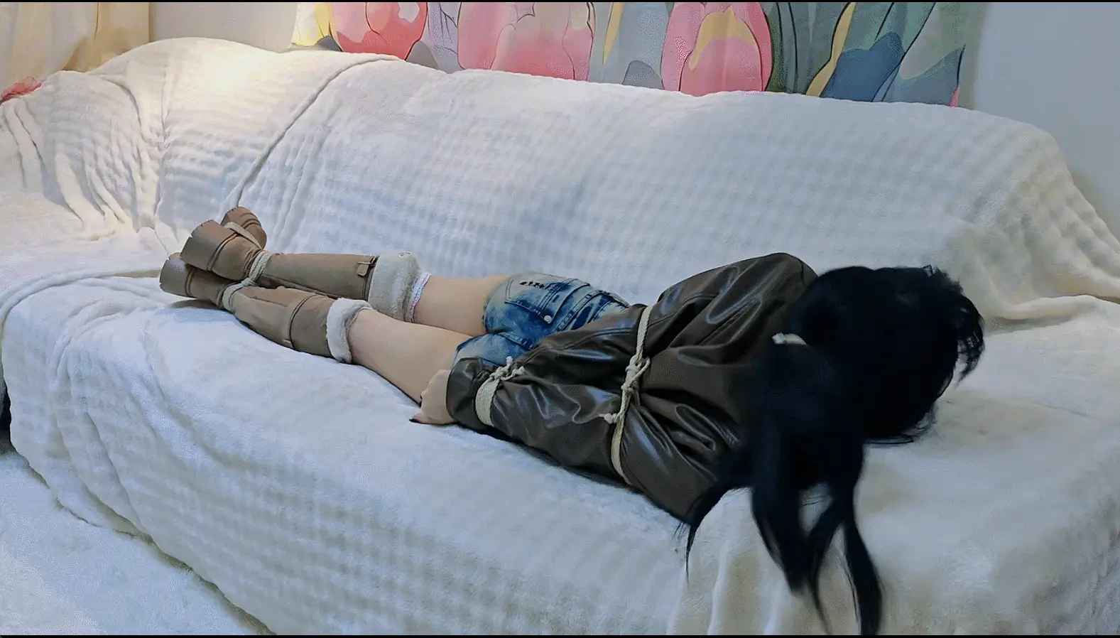 捆绑挣扎,超短裤和长筒靴,配了小皮衣,捆绑了身体,手腕,脚踝还有鞋子,本来是准备后面绑好驷马后再拍一段时间,但是挣扎的时候不小心从沙发上掉下去了,摔的有点太疼了所以就提前停止录制了hh。