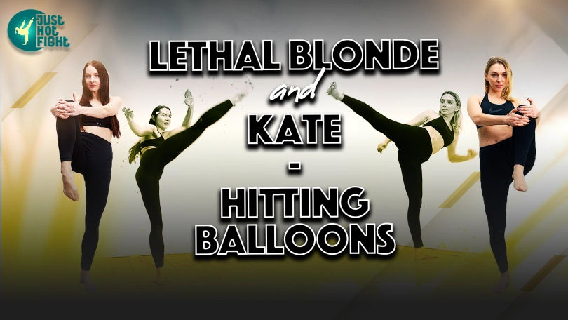 Olga and Kate burst the balloons with leg kicks. First they are in tights, then they take them off and hit the balls barefoot.